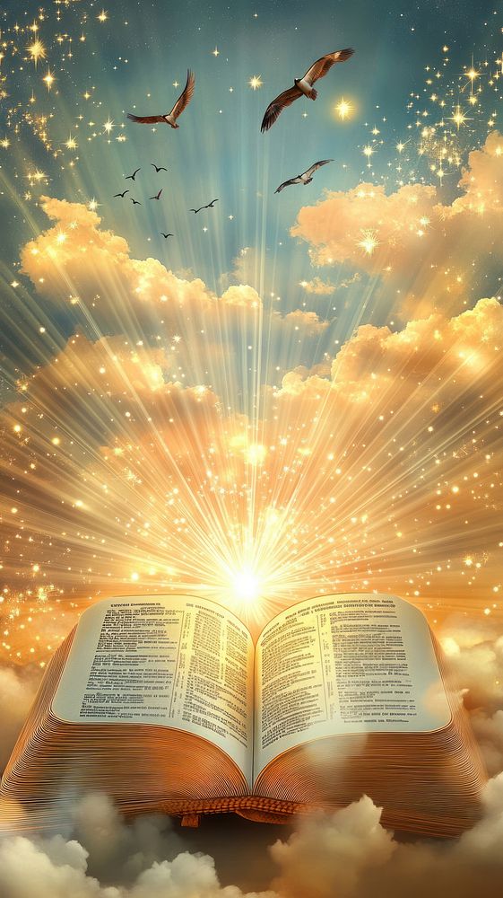 Bible with pages glowing birds sky atmosphere. https://www.rawpixel.com/image/17048389/bible-with-pages-glowing-birds-sky-atmosphereView license