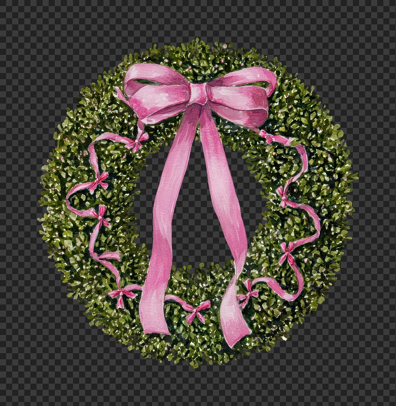 PNG Festive wreath with pink ribbon. https://www.rawpixel.com/image/24021586/png-festive-wreath-with-pink-ribbonView license