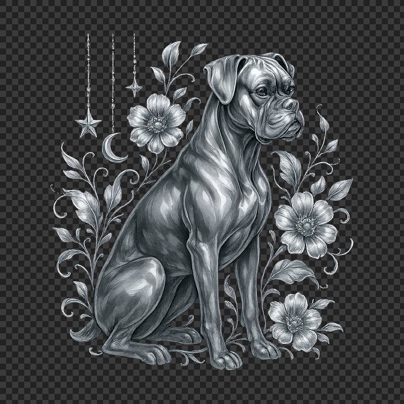 PNG Boxer dog with floral elements. https://www.rawpixel.com/image/23547791/png-boxer-dog-with-floral-elementsView license