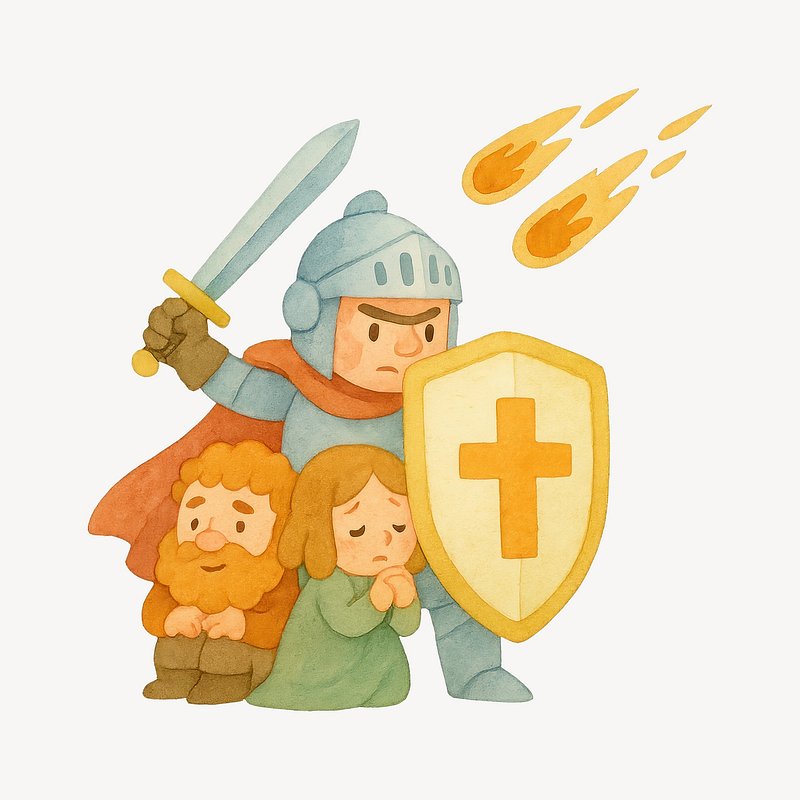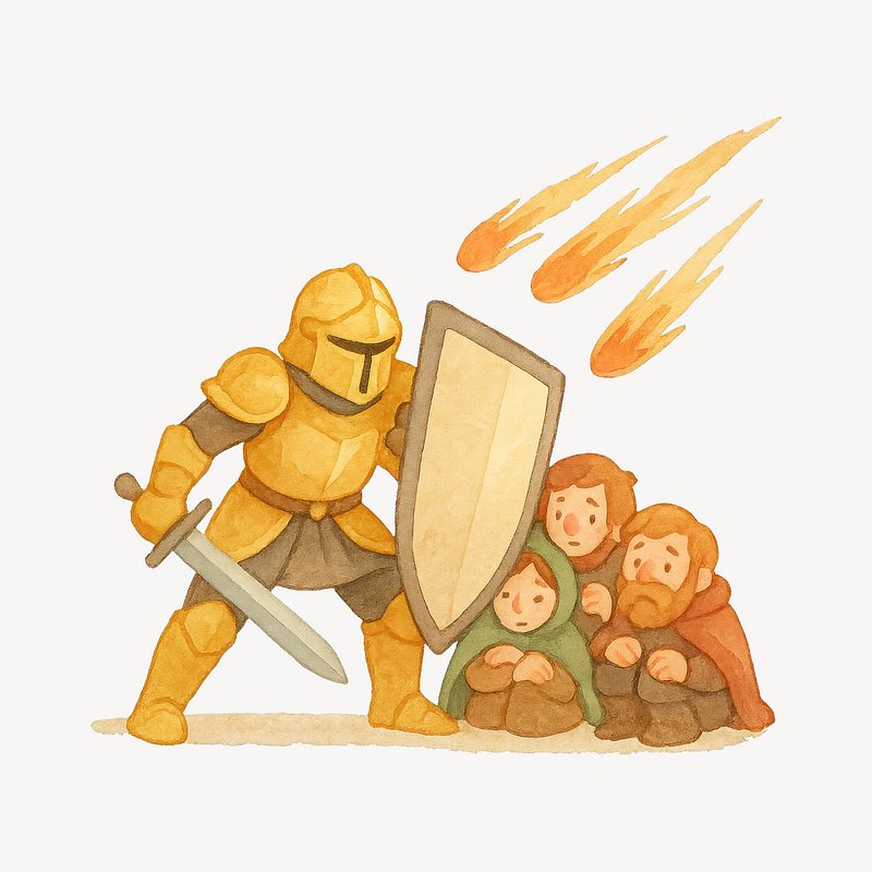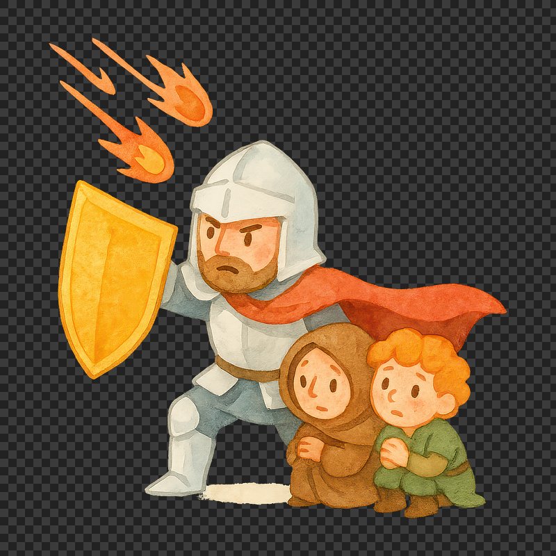 Knight shields villagers from meteors. https://www.rawpixel.com/image/20677384/knight-shields-villagers-from-meteorsView license