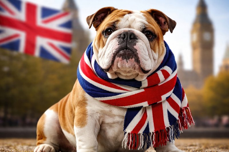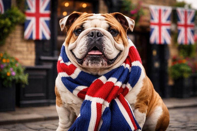 Bulldog wearing British flag scarf. https://www.rawpixel.com/image/25322461/bulldog-wearing-british-flag-scarfView license