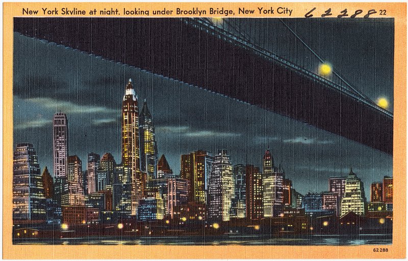 New York skyline at night, looking under Brooklyn Bridge, New York City (1930–1945) chromolithograph. Original public domain… https://www.rawpixel.com/image/10542840/image-texture-moon-artsFree Image from public domain license