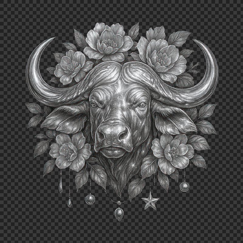 PNG Buffalo adorned with floral elements. https://www.rawpixel.com/image/23543460/png-buffalo-adorned-with-floral-elementsView license