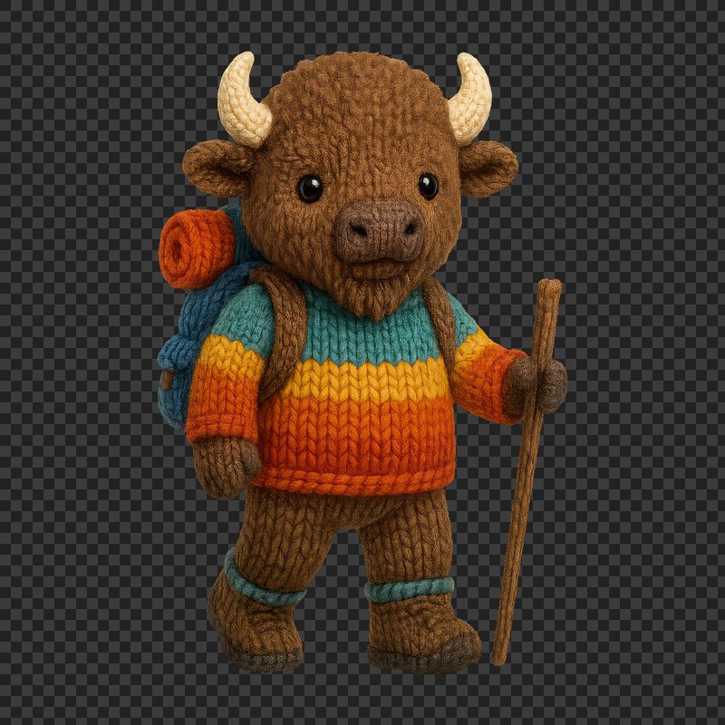 PNG Cute knitted buffalo adventurer https://www.rawpixel.com/image/24440628/png-cute-knitted-buffalo-adventurerView license