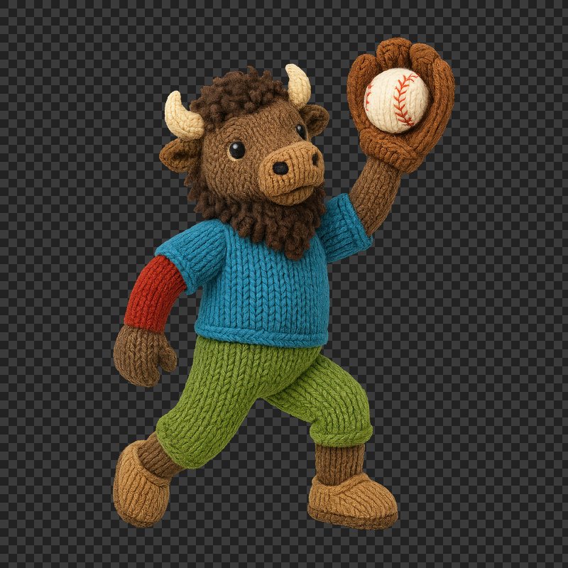 PNG Knitted bison playing baseball. https://www.rawpixel.com/image/24444031/png-knitted-bison-playing-baseballView license