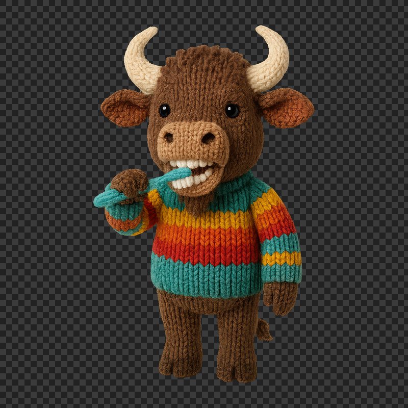 PNG Cute knitted bull brushing teeth. https://www.rawpixel.com/image/24444060/png-cute-knitted-bull-brushing-teethView license
