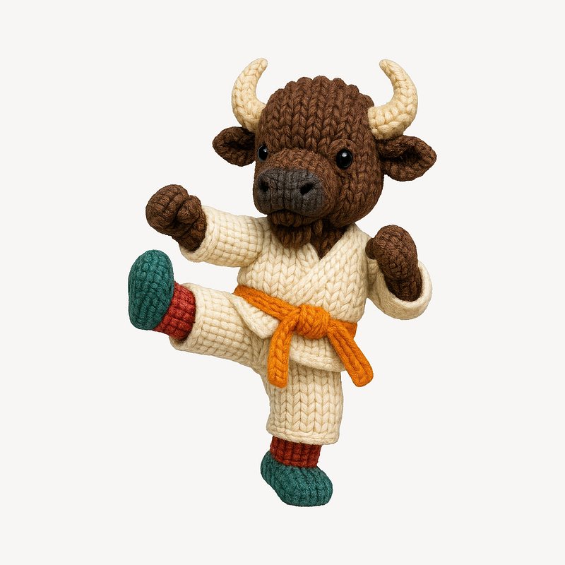 Crocheted buffalo practicing karate. https://www.rawpixel.com/image/24534289/crocheted-buffalo-practicing-karateView license