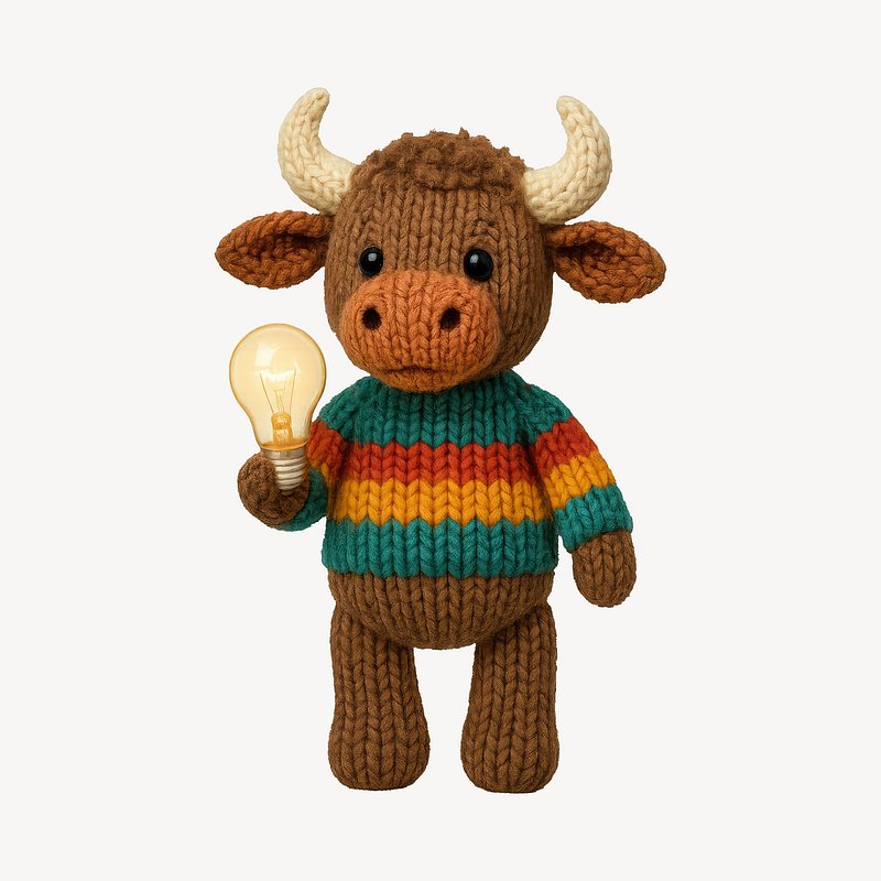 Cute knitted bull holding lightbulb. https://www.rawpixel.com/image/24531427/cute-knitted-bull-holding-lightbulbView license