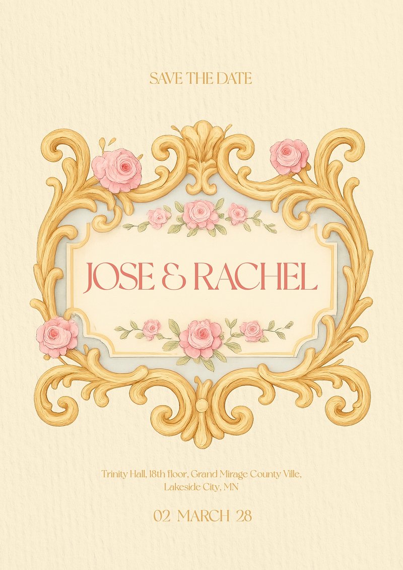 Elegant save the date card with ornate floral design. Features gold and pink roses. Perfect for weddings. Vintage style with… https://www.rawpixel.com/image/18305362/image-background-png-transparentView license