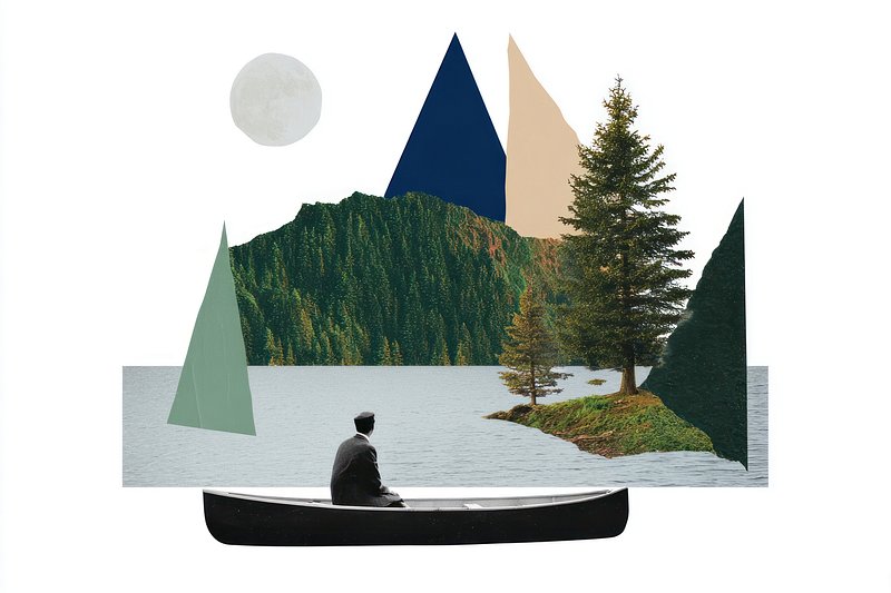 Man sailing canoe collage nature trees. https://www.rawpixel.com/image/18176929/man-sailing-canoe-collage-nature-treesView license