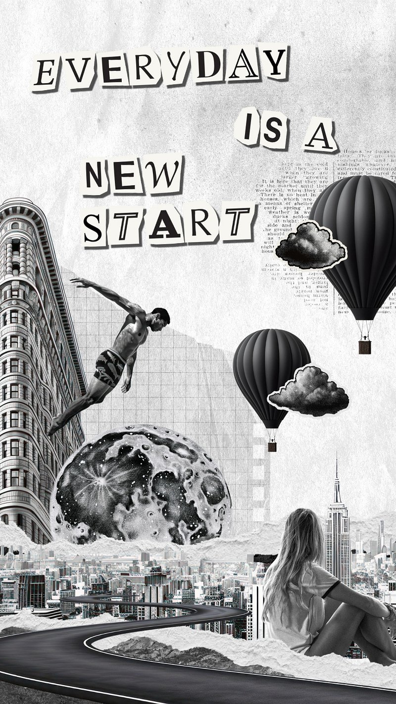 Retro monochrome collage with 'Everyday is a new start' text, cityscape, and balloons template design template design https://www.rawpixel.com/image/22772272/image-wallpaper-mobile-backgroundView license