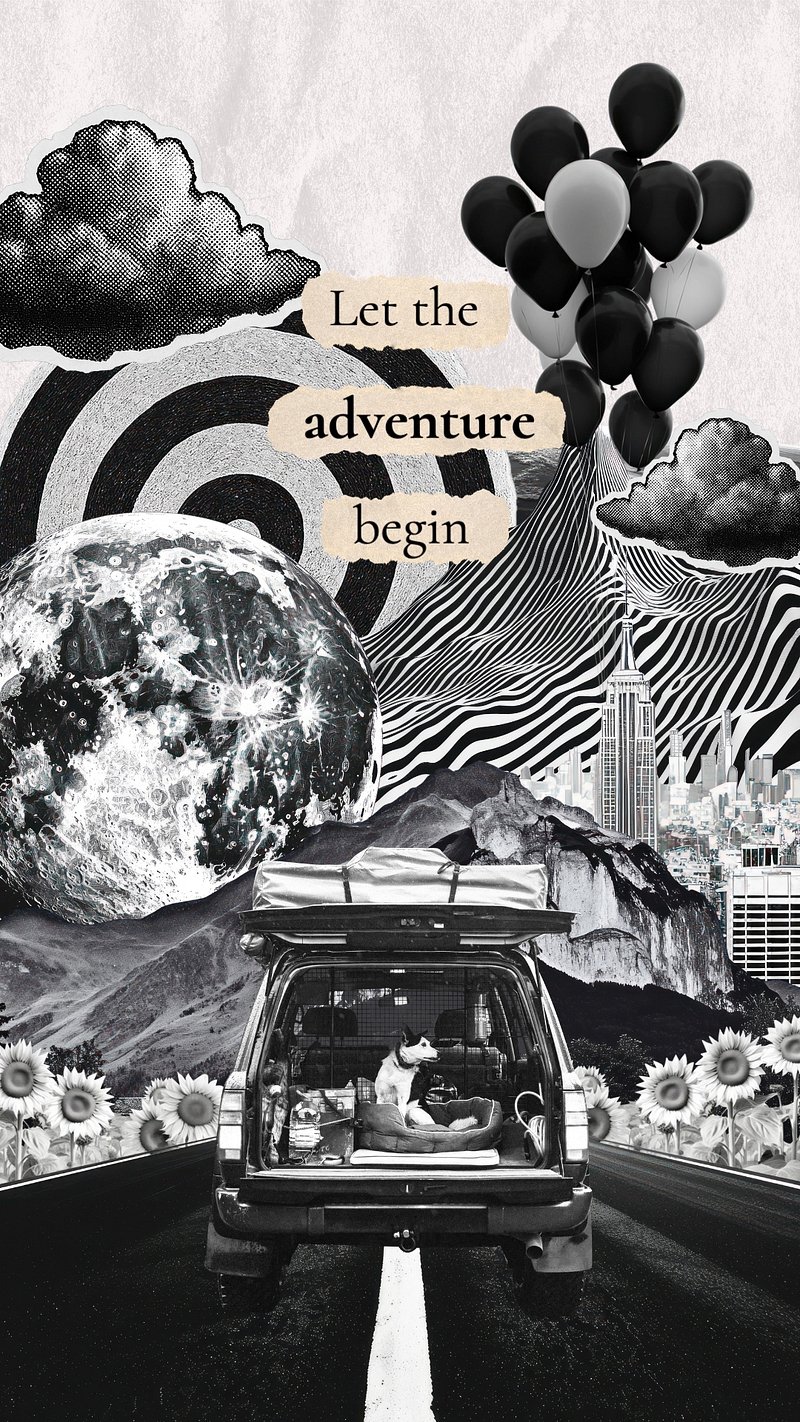 Retro monochrome collage with 'Let the adventure begin' text, surreal elements template design template design https://www.rawpixel.com/image/22772415/image-wallpaper-mobile-backgroundView license