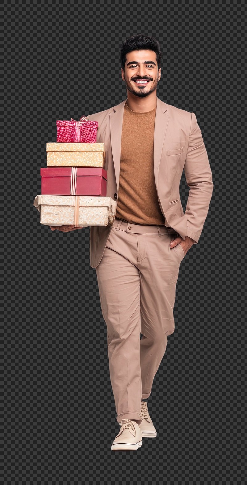 PNG Smiling man carrying gifts. https://www.rawpixel.com/image/20890165/png-smiling-man-carrying-giftsView license