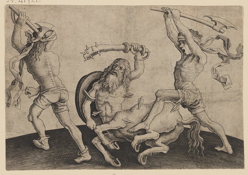 The Battle of Two Men with the Centaur, ca. 1480 by master i. a. m. von zwolle https://www.rawpixel.com/image/18940792/the-battle-two-men-with-the-centaur-ca-1480-master-von-zwolleFree Image from public domain license