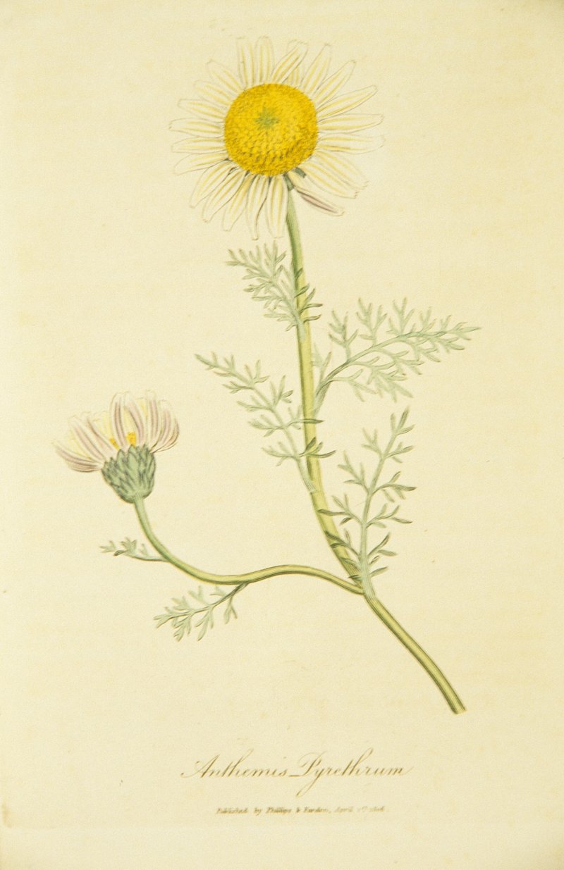 Mount Atlas daisy (Anthemis pyrethrum) illustration from Medical Botany (1836) by John Stephenson and James Morss Churchill . https://www.rawpixel.com/image/327067/premium-illustration-psd-chamomile-john-stephenson-botanical-flowerView license