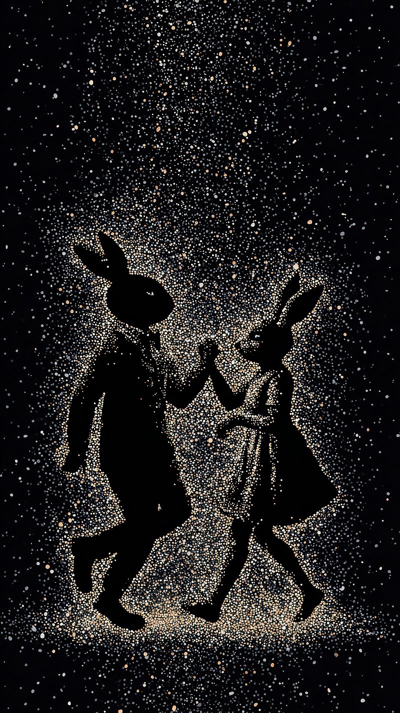 Dancing rabbits under starry sky. https://www.rawpixel.com/image/25628383/image-wallpaper-background-frameView license