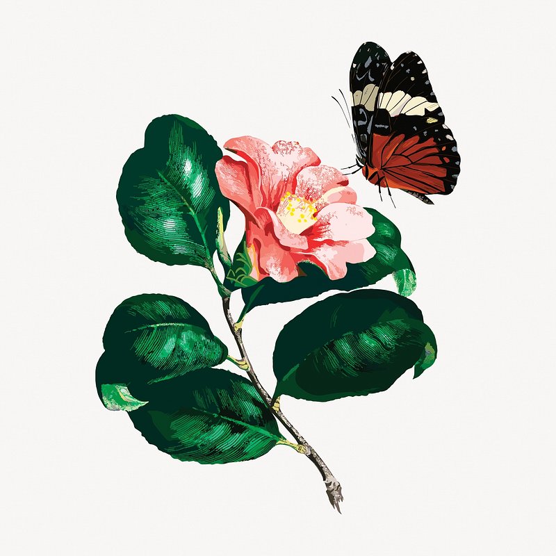 Japanese camellia vintage flower, remix from artworks by Charles Dessalines D'orbigny, illustration isolated on white… https://www.rawpixel.com/image/16899135/vector-butterfly-animal-flowerView license
