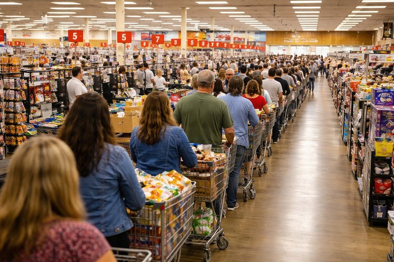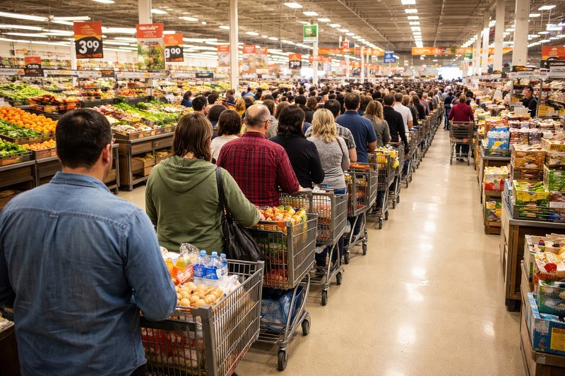 Long supermarket checkout line. https://www.rawpixel.com/image/25176703/long-supermarket-checkout-lineView license