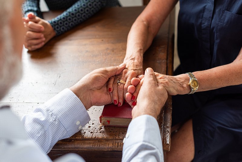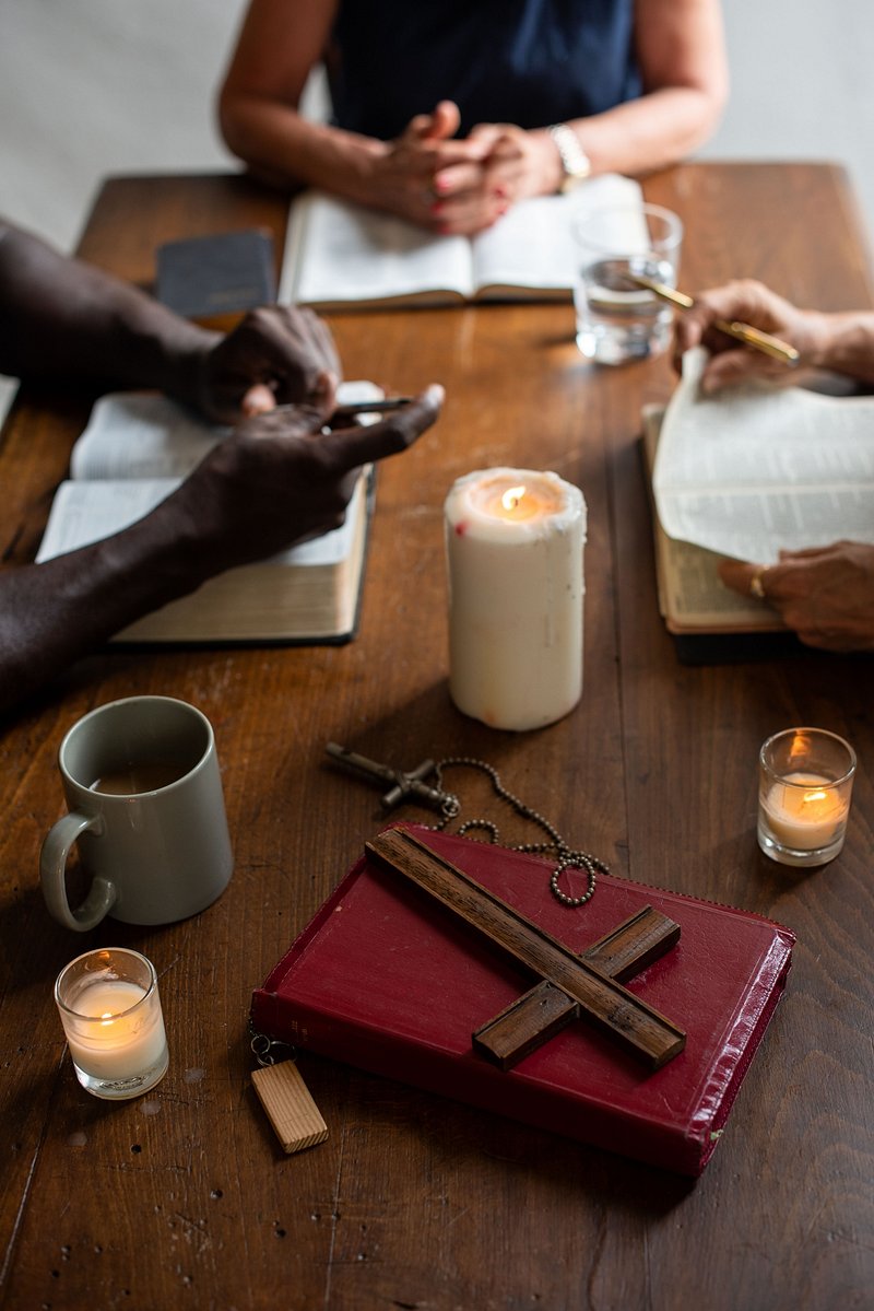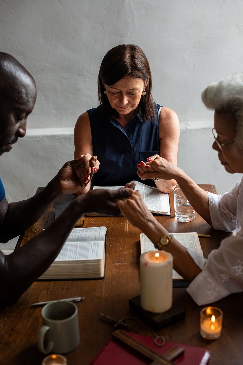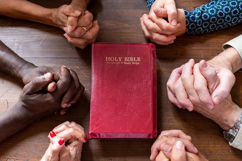 Group prayer around Bible https://www.rawpixel.com/image/26095697/group-prayer-around-bibleView license