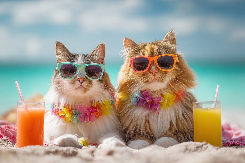 Cats relaxing beachside with drinks. https://www.rawpixel.com/image/25629235/cats-relaxing-beachside-with-drinksView license