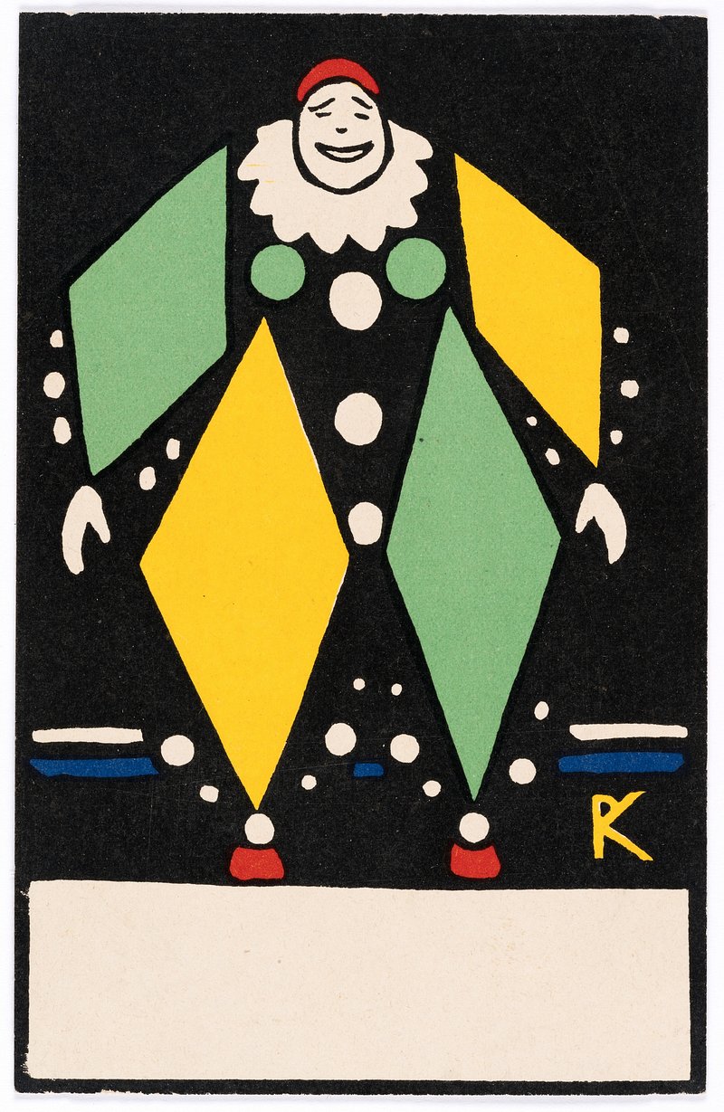Postcard from the Wiener Werkstätte No. 94: Clown (1907) by Rudolf Kalvach and Wiener Werkstätte https://www.rawpixel.com/image/11622301/image-cartoon-art-vintageFree Image from public domain license