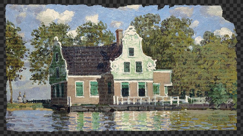 PNG Houses by the Bank of the River Zaan, 1871 – 1872 by claude monet. Remixed by rawpixel. https://www.rawpixel.com/image/25417500/png-torn-paperView license
