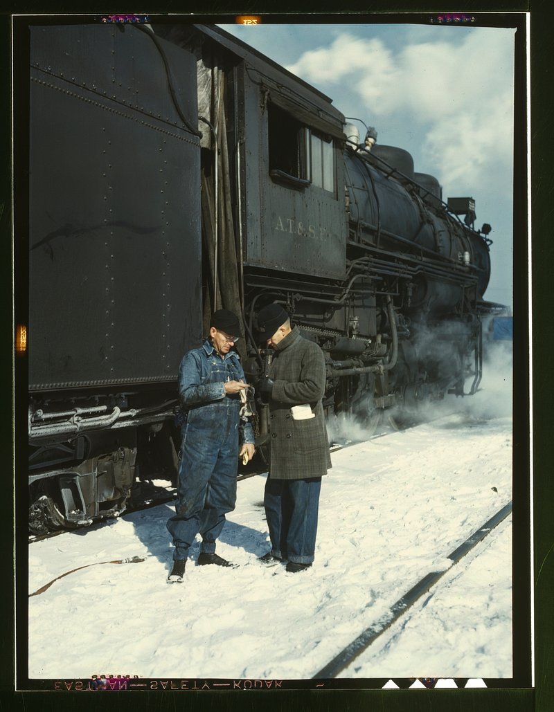 Atchison, Topeka, and Santa Fe railroad conductor George E. Burton and engineer J.W. Edwards comparing time before pulling… https://www.rawpixel.com/image/7506800/photo-image-steam-person-manFree Image from public domain license