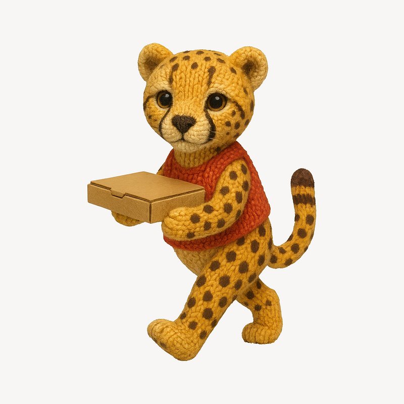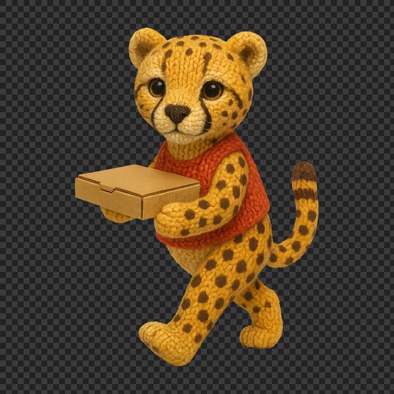 Cute knitted cheetah delivering pizza. https://www.rawpixel.com/image/24534314/cute-knitted-cheetah-delivering-pizzaView license