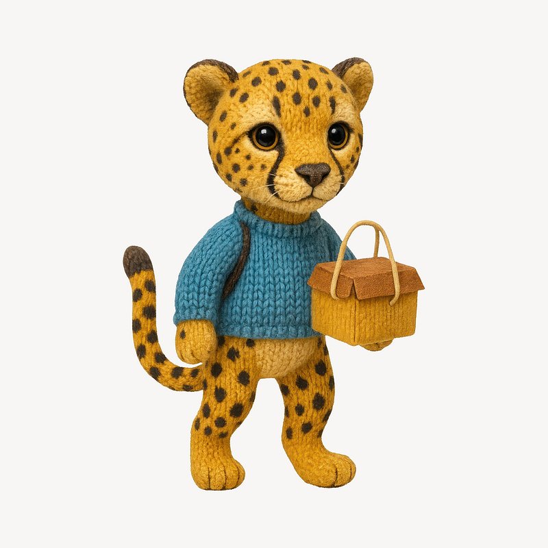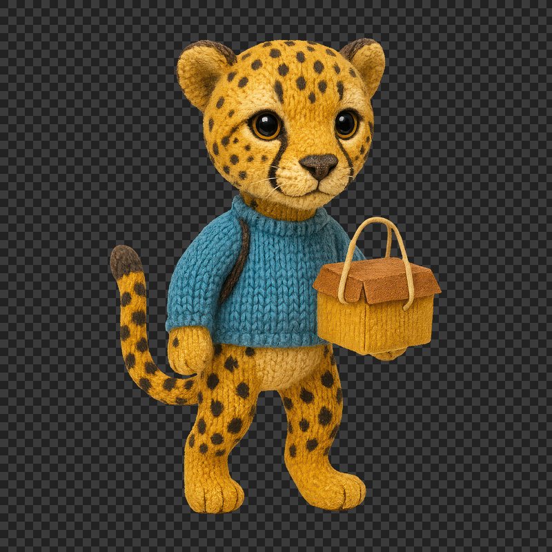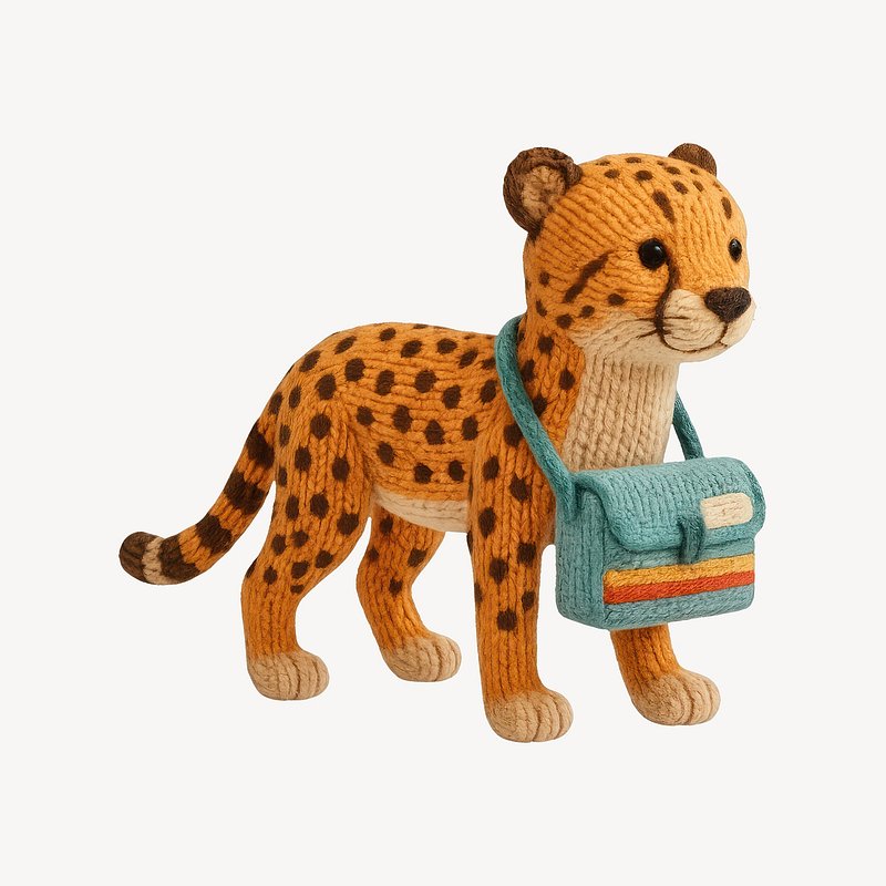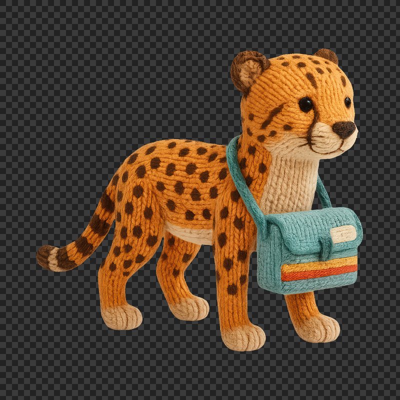 PNG Knitted cheetah toy with bag https://www.rawpixel.com/image/24443814/png-knitted-cheetah-toy-with-bagView license