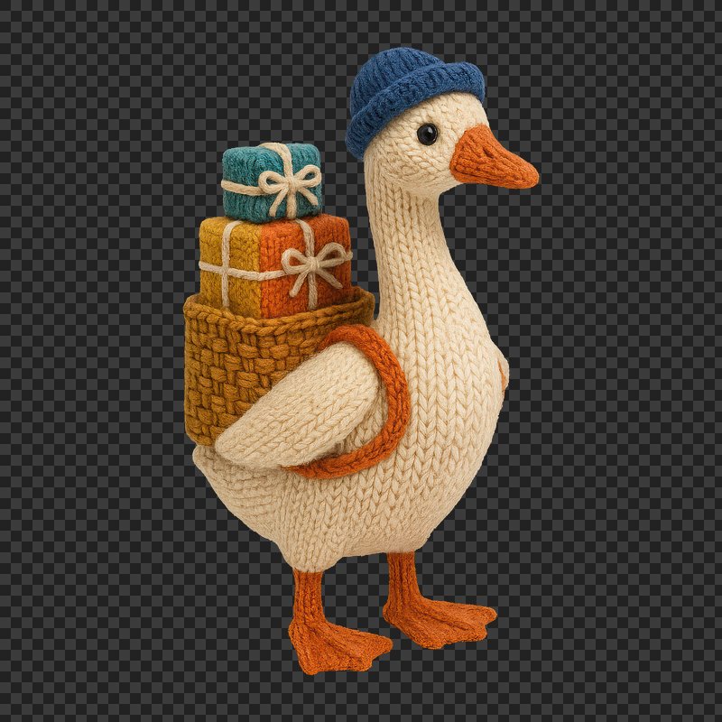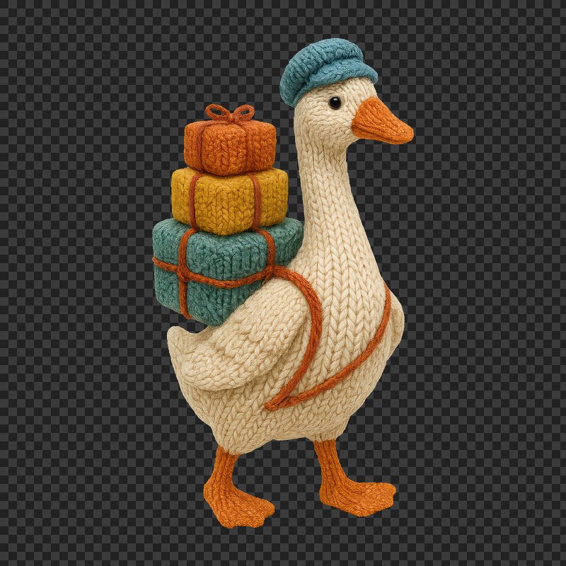 PNG Knitted goose carrying colorful gifts. https://www.rawpixel.com/image/24480185/png-knitted-goose-carrying-colorful-giftsView license