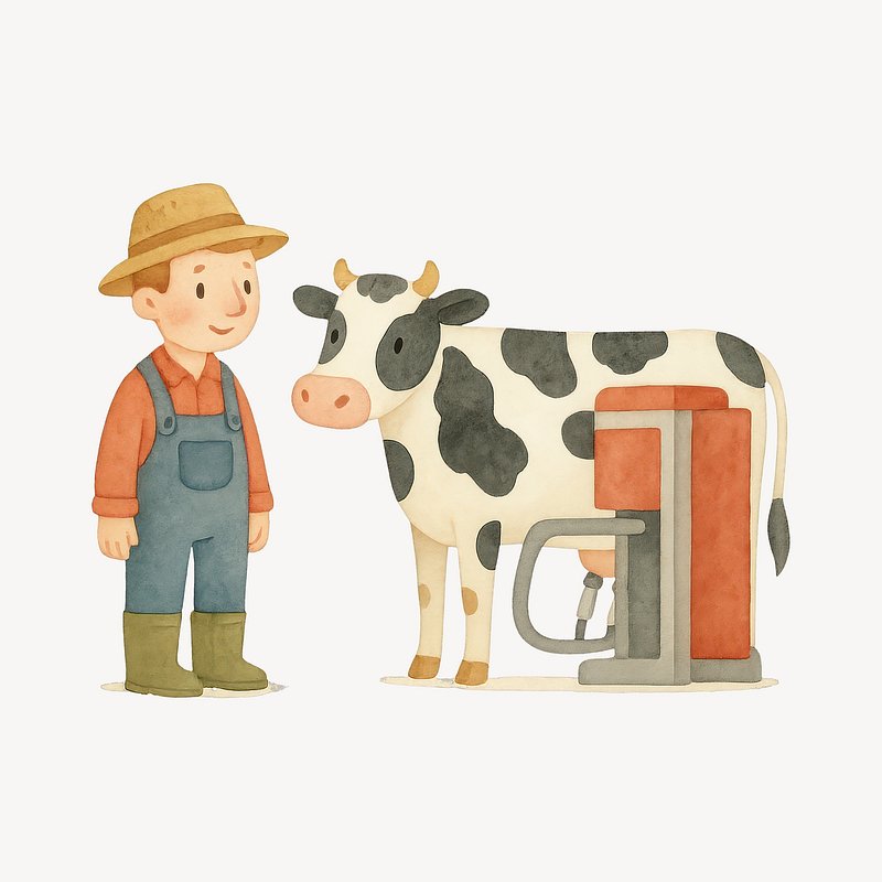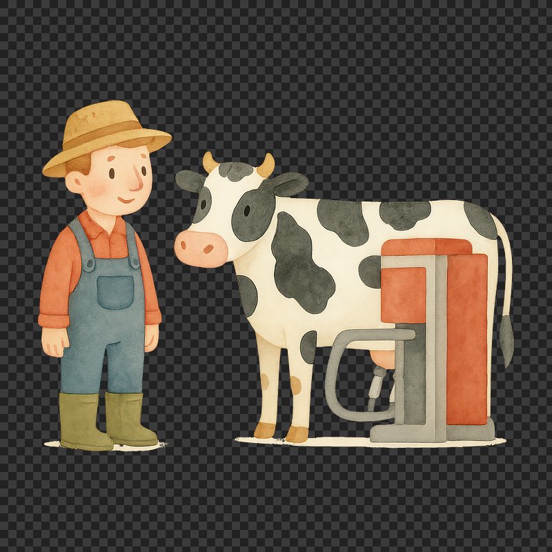 PNG Farmer with cow and milking machine. https://www.rawpixel.com/image/19216230/png-farmer-with-cow-and-milking-machineView license