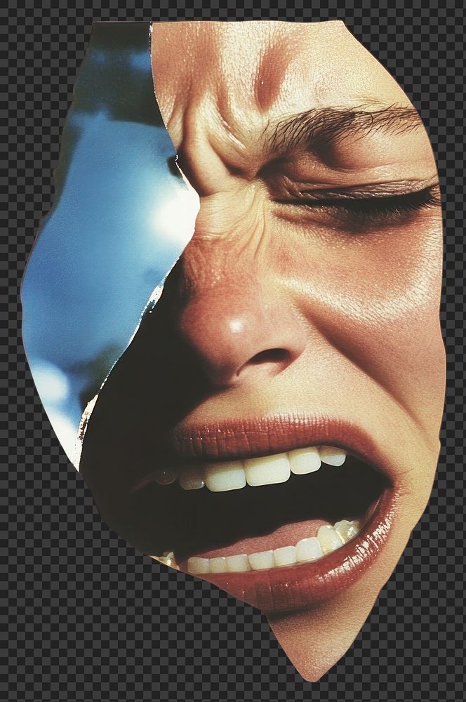 Sad woman png sticker, surreal escapism transparent background https://www.rawpixel.com/image/6300479/png-face-torn-paper-cloudView license