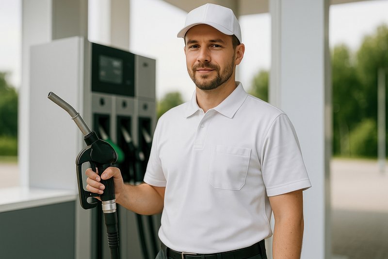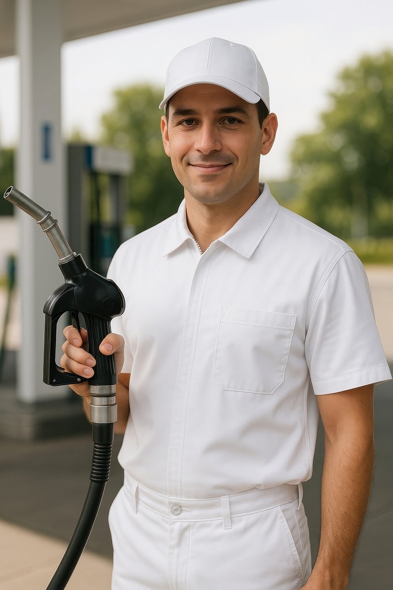 Gas station attendant holding nozzle. https://www.rawpixel.com/image/24553021/gas-station-attendant-holding-nozzleView license