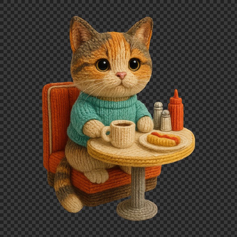 PNG Adorable knitted cat dining https://www.rawpixel.com/image/24477745/png-adorable-knitted-cat-diningView license