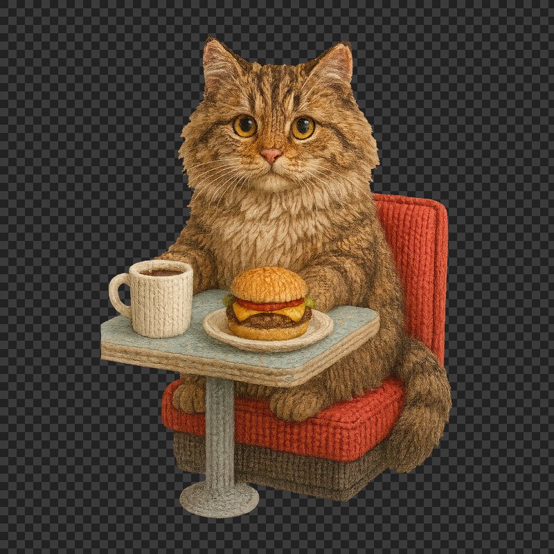 PNG Cat enjoying burger breakfast delight. https://www.rawpixel.com/image/24523955/png-cat-enjoying-burger-breakfast-delightView license
