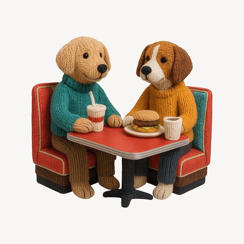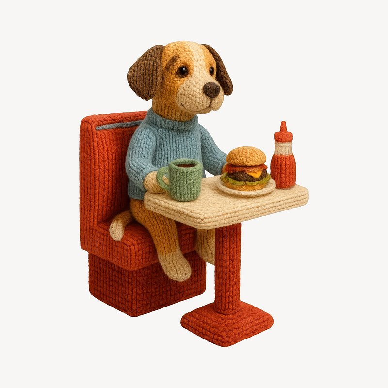 Knitted dogs dining together joyfully. https://www.rawpixel.com/image/24532200/knitted-dogs-dining-together-joyfullyView license