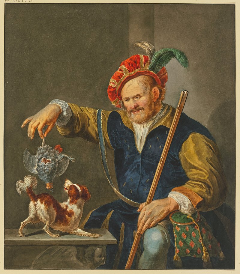 Ein von der Jagd gekommener Jäger in reicher Tracht zeigt seinem Hund ein Rebhuhn, null by r. meurs pruysenaar https://www.rawpixel.com/image/18934963/image-dog-bird-personFree Image from public domain license
