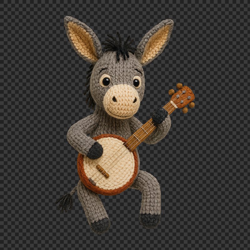 PNG Crocheted donkey playing banjo. https://www.rawpixel.com/image/24441595/png-crocheted-donkey-playing-banjoView license