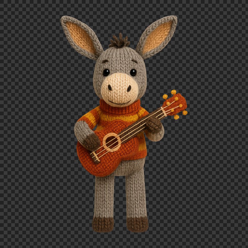 PNG Cute knitted donkey playing guitar. https://www.rawpixel.com/image/24445092/png-cute-knitted-donkey-playing-guitarView license