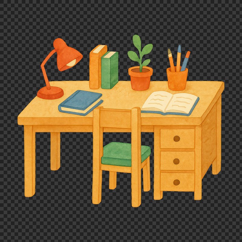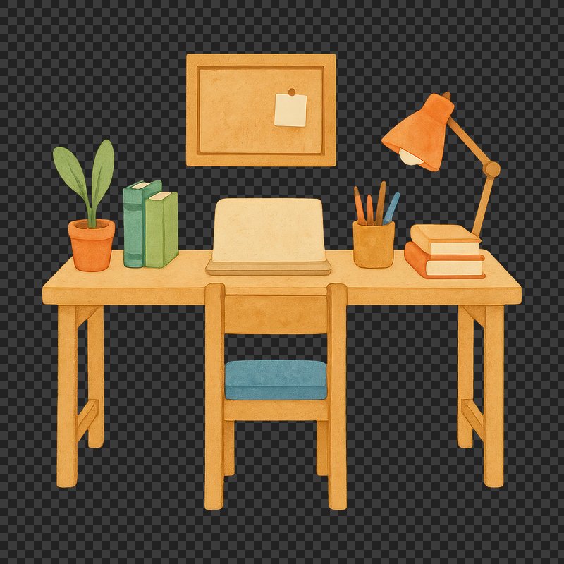 PNG Cozy desk with study essentials. https://www.rawpixel.com/image/18907985/png-cozy-desk-with-study-essentialsView license