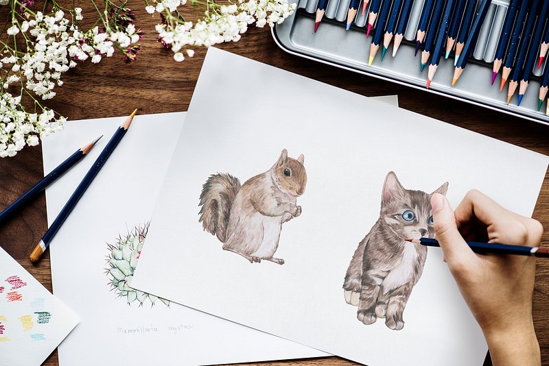 Illustrationist coloring adorable animals workspace concept https://www.rawpixel.com/image/385181/free-psd-cat-artist-squirrelView license