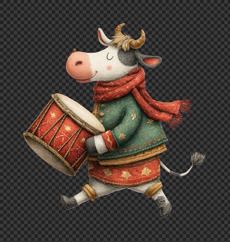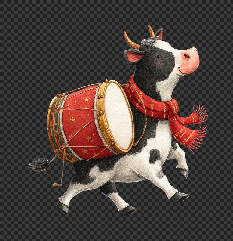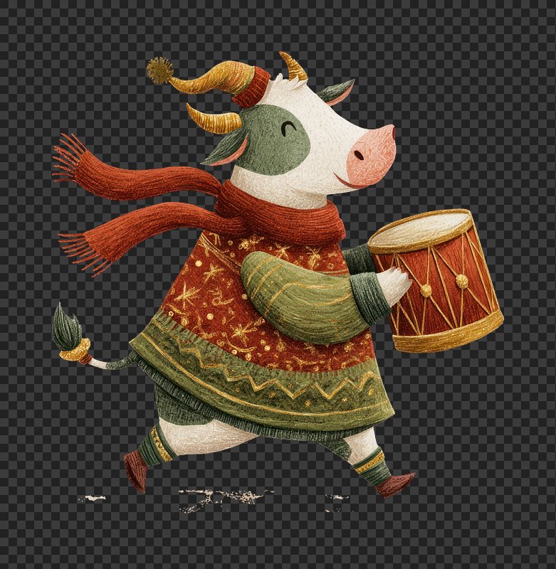 PNG Festive cow drumming joyfully. https://www.rawpixel.com/image/24021932/png-festive-cow-drumming-joyfullyView license