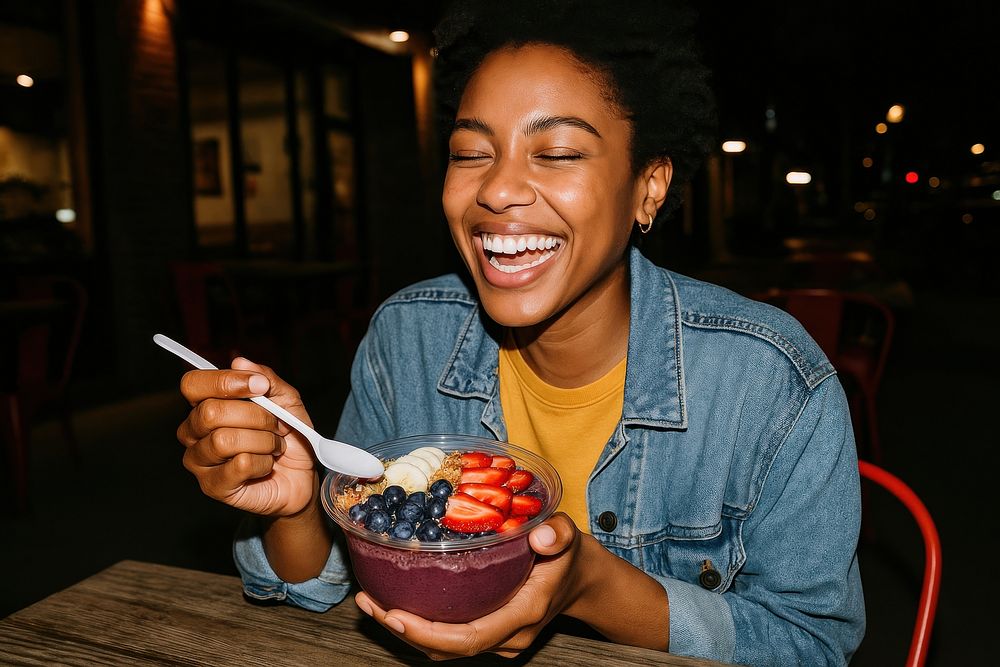 Joyful woman enjoying acai bowl. https://www.rawpixel.com/image/17329431/joyful-woman-enjoying-acai-bowlView license