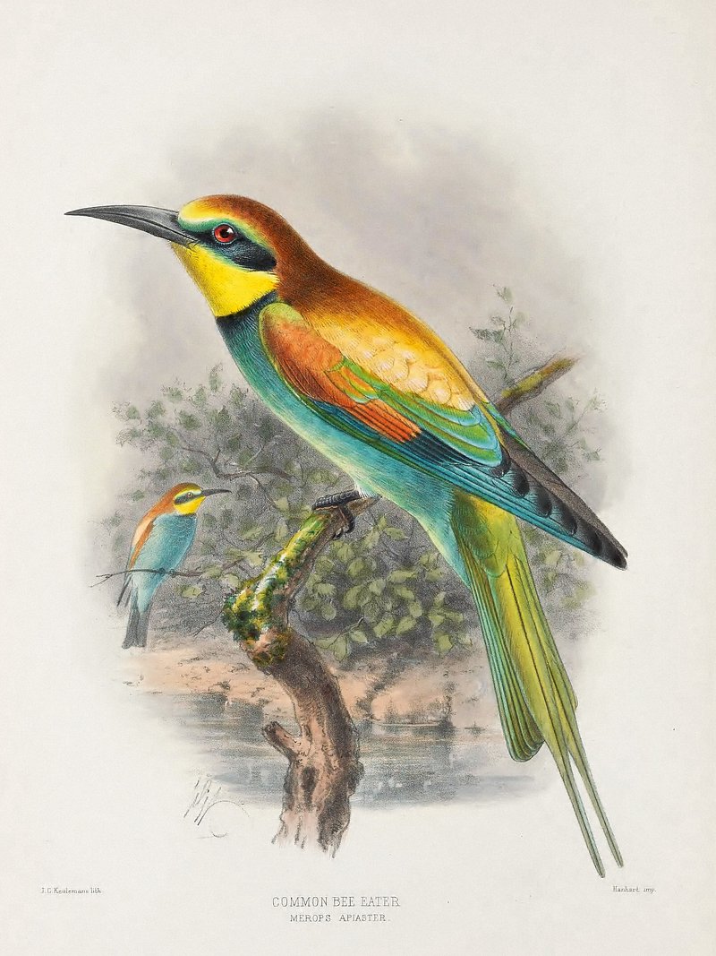 Common Bee Eater or European Bee Eater or Merops Apiaster from A Monograph of The Meropidae (1884-1886) by Henry Eeles… https://www.rawpixel.com/image/16780346/image-animal-bird-artFree Image from public domain license