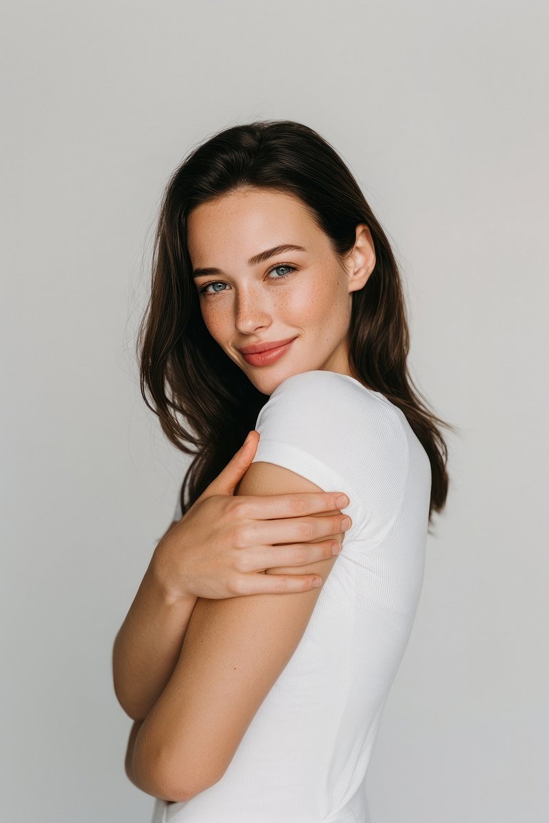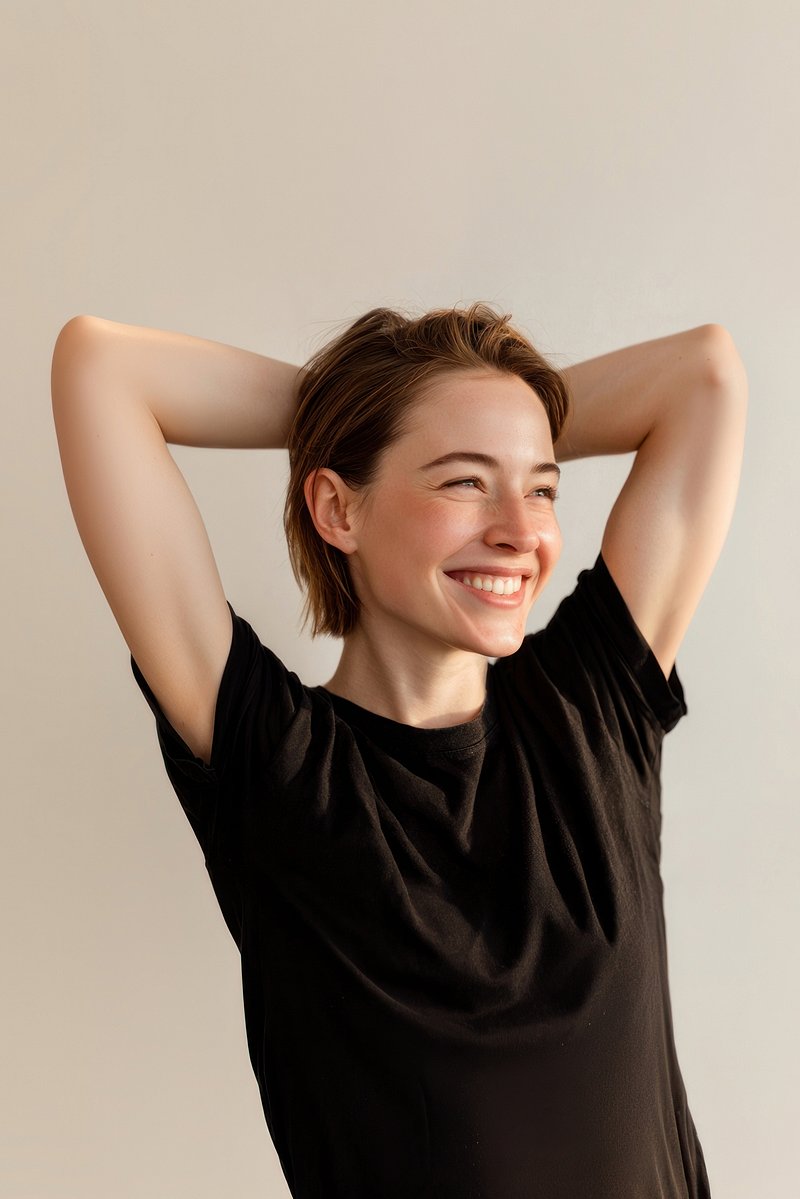 Smiling woman embracing herself. https://www.rawpixel.com/image/25586482/smiling-woman-embracing-herselfView license