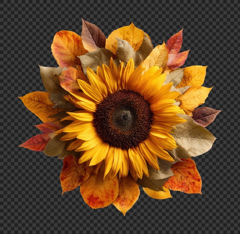 PNG Sunflower autumn leaves arrangement https://www.rawpixel.com/image/25814851/png-sunflower-autumn-leaves-arrangementView license