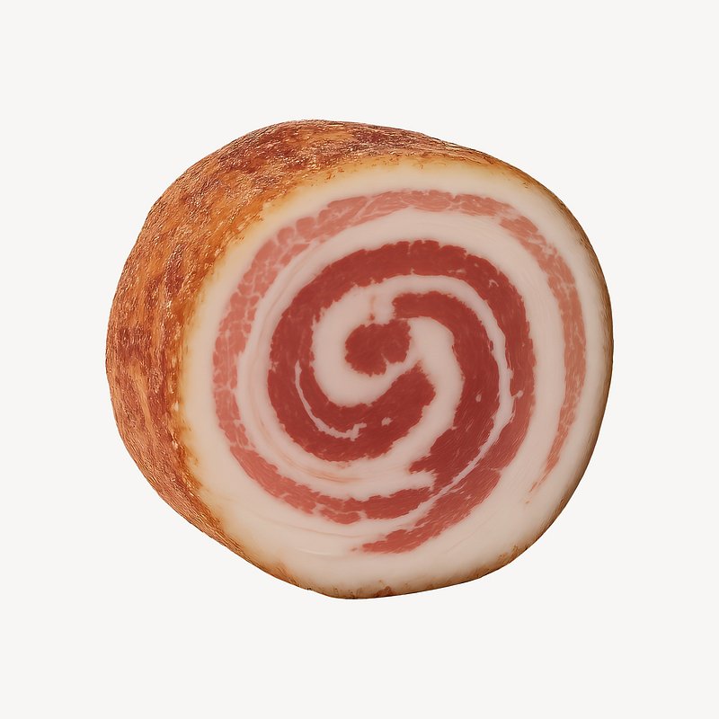 Spiral cut of pancetta meat. https://www.rawpixel.com/image/21470563/spiral-cut-pancetta-meatView license