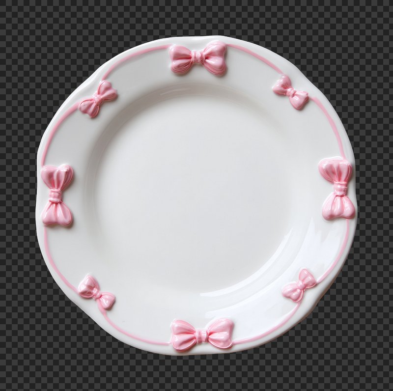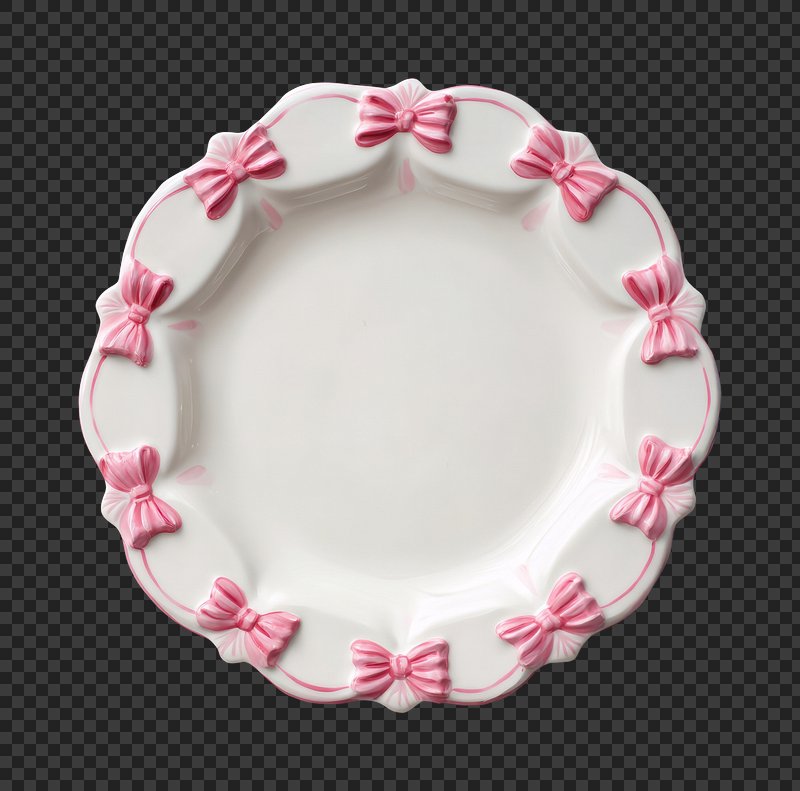 PNG Elegant plate with pink bows https://www.rawpixel.com/image/24021315/png-elegant-plate-with-pink-bowsView license