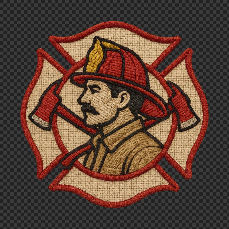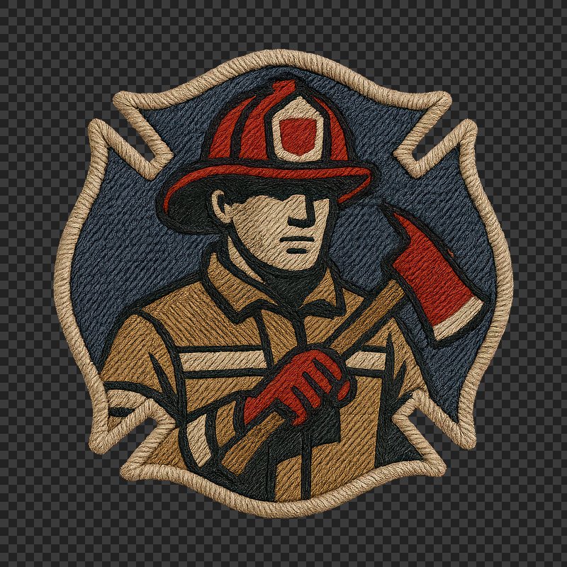 PNG Embroidered firefighter patch illustration. https://www.rawpixel.com/image/24371389/png-embroidered-firefighter-patch-illustrationView license