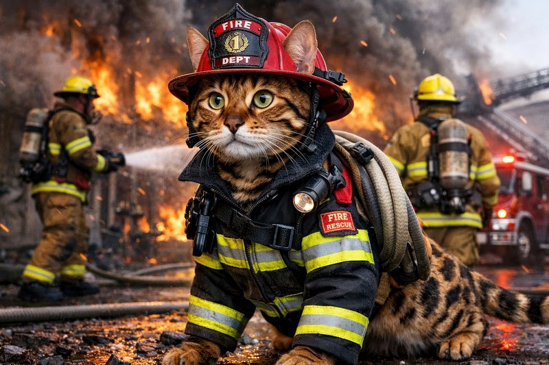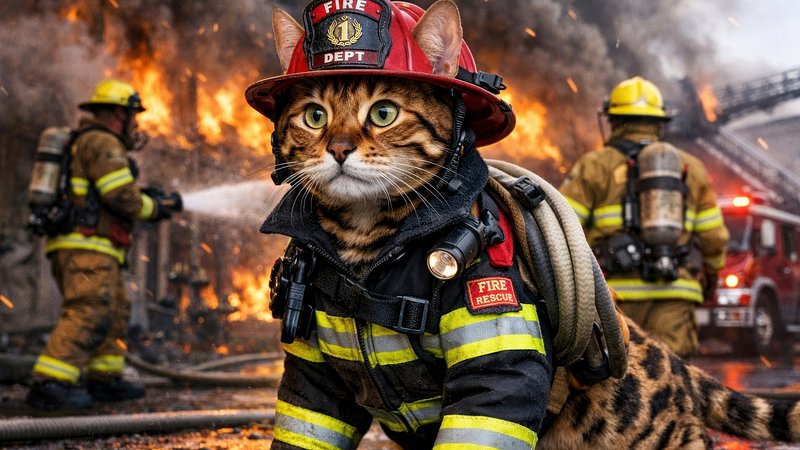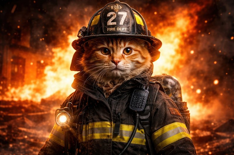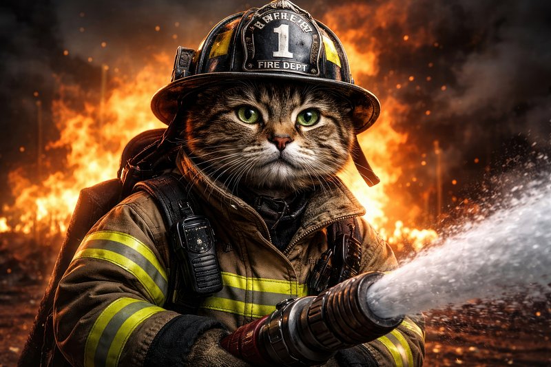 Cat firefighter battles blaze heroically. https://www.rawpixel.com/image/25323003/cat-firefighter-battles-blaze-heroicallyView license